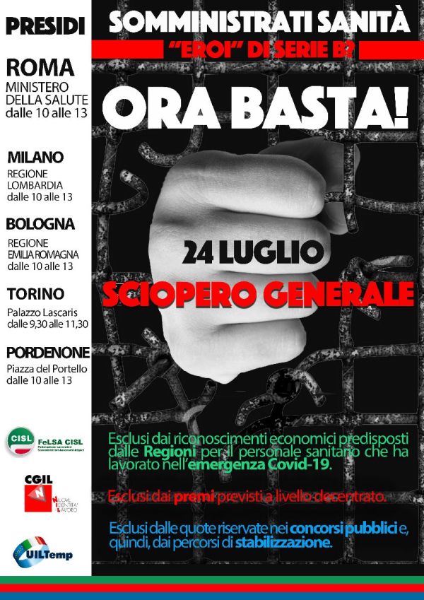 Alla luce del percorso sindacale fin qui svolto, UILTemp, NidiL CGIL e FeLSA CISL hanno proclamato lo sciopero nazionale dei lavoratori somministrati impegnati nel comparto sanità per l’intera giornata di venerdì 24 luglio 2020, prevedendo per quella data un presidio nazionale presso il Ministero della Salute e altri quattro presidi regionali a Torino, Milano Bologna e Pordenone.